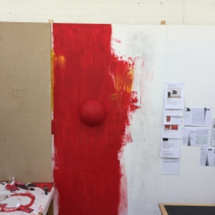 After figuring out where to place my red hemisphere i decide to rather have two colours the red and yellow the work would stand out more if it was all one colour. I decide to paint over all the yellow over a section of my wall as well as any remaining white patches with red changing the wall into one solid block of colour